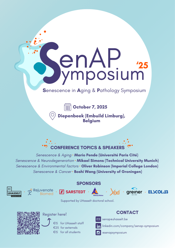 We proudly announce the second edition of the ‘Senescence in Aging and Pathology (SenAP) symposium’, taking place on October 7th 2025, in Diepenbeek (Embuild building). This symposium is organised by PhD students from Hasselt University.